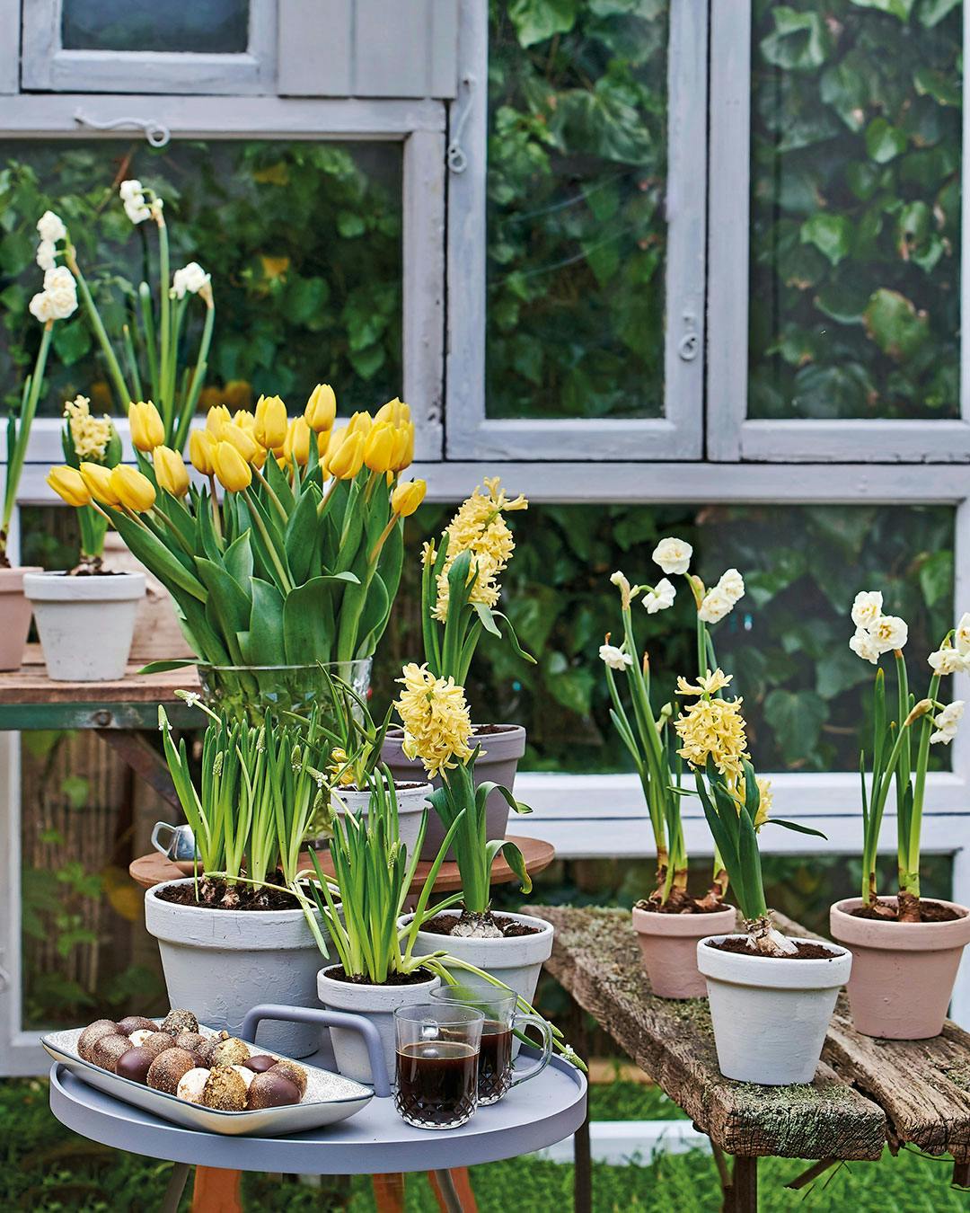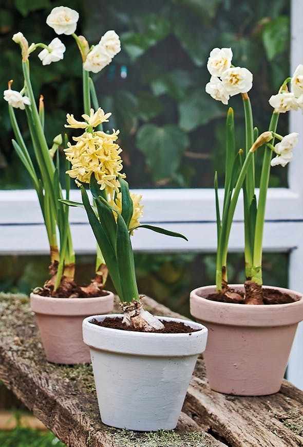 Tip: Løgplanterne kan holde længe uden vand i dekorationen. Du kan dog godt sprøjte lidt vand i skallerne hver anden dag med en vandforstøver. Gem løgene, når de er afblomstret, og læg dem i havens bede.