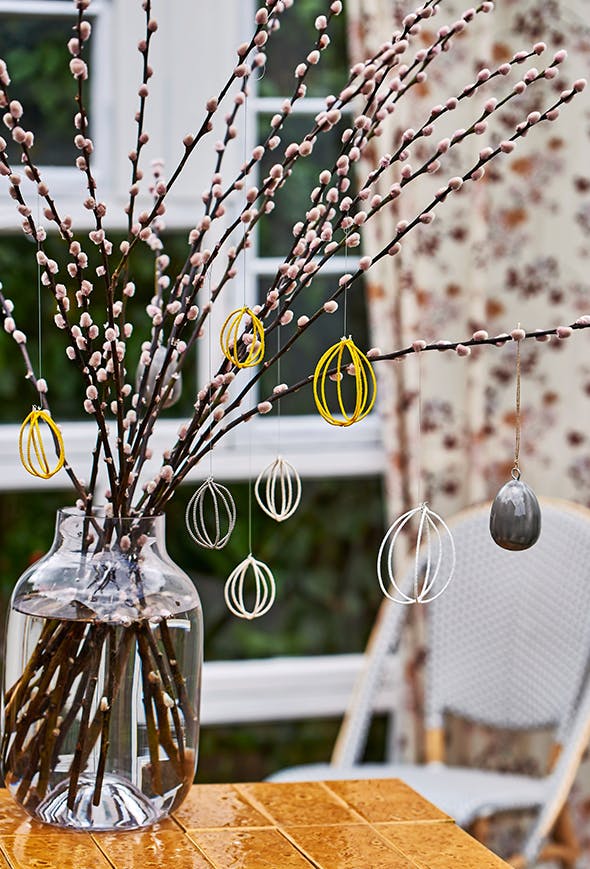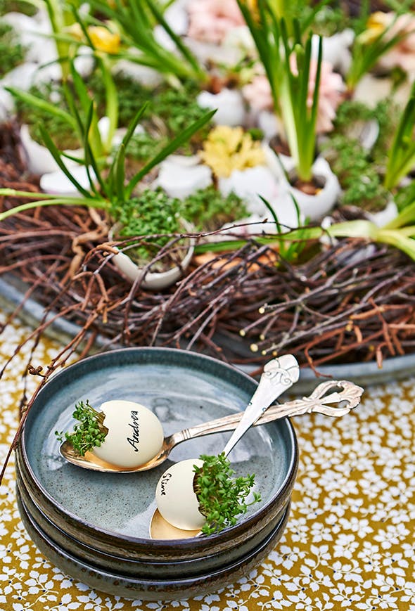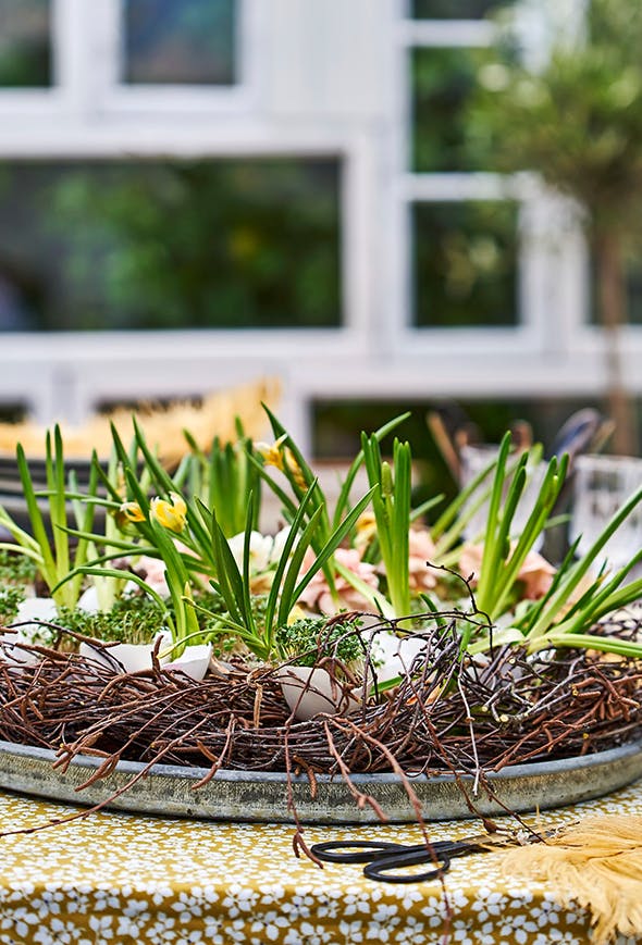Lav en stor krans af hængebirkgrene, der passer til dit fad. Bind enderne sammen med vindseltråd. Slå 20-30 æg ud, og gem de skaller, der ikke er gået itu. Skyl og rens dem godt. Placér dem på fadet, og plant små løgplanter i nogle af de højeste skaller – det nemmeste er at dele løgplanterne og ryste jorden af, inden du placerer dem i dekorationen. Kom karse i nogle af skallerne, og fyld vand i 5-6 høje skaller, så du kan bruge dem som minivaser til hyacinter og nelliker. Så er dekorationen færdig.