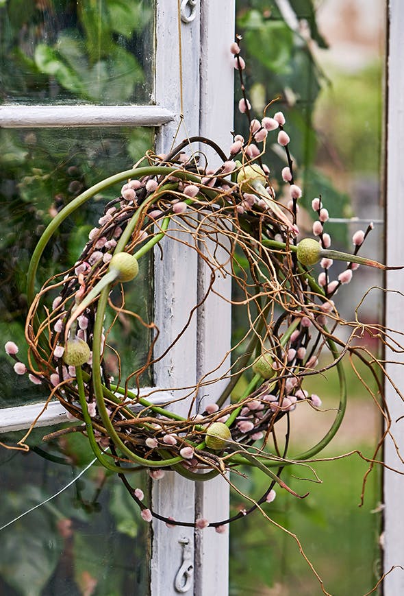 Bind først en krans af gæslingegrene, og fæst enderne med vindseltråd. Vikl derefter de bøjelige grene en efter en ind i kransen, så de stritter lidt, og afslut med at vikle de sjove løgvækster ind i kransen. Hæng kransen op på døren i en tynd lædersnøre.