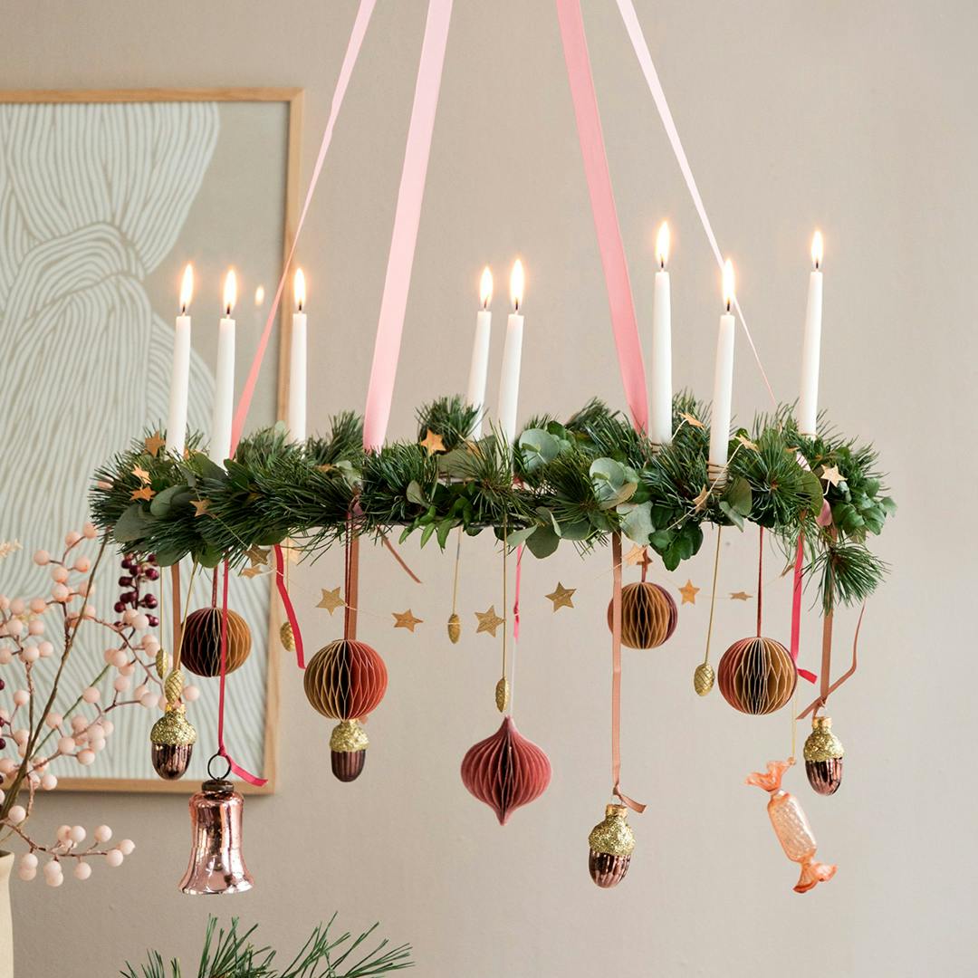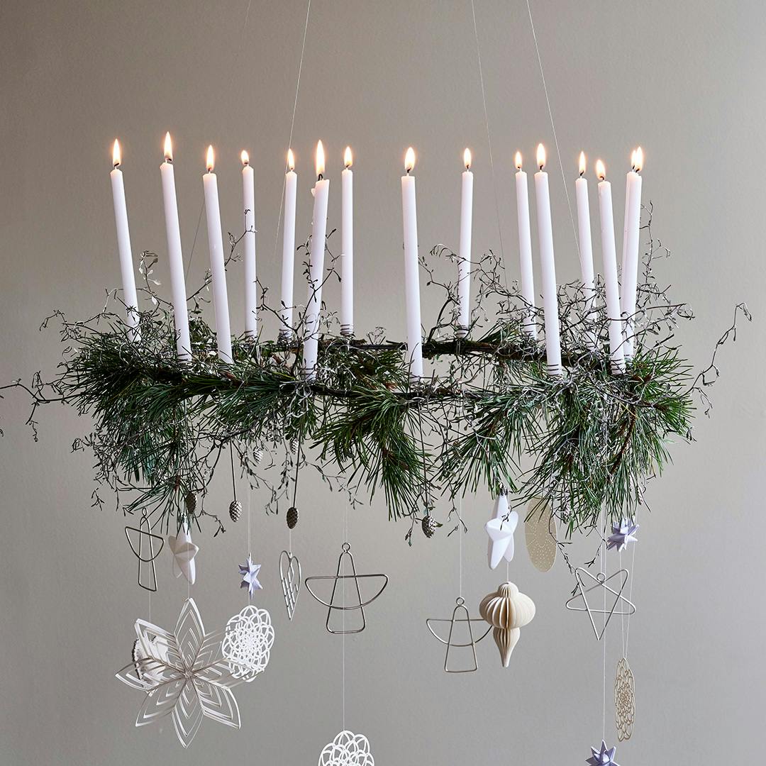 Lav en lidt utraditionel krans, og sæt flere lys i en stor krans. Hæng den op, og lad den svæve over spisebordet eller i hjørnet af stuen.