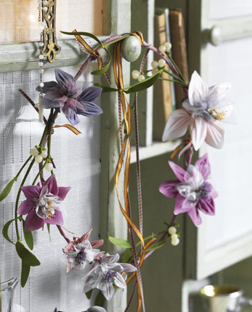 - Vikl med små stykker vindseltråd mindre grene af mistelten på kransen imellem blomsterne.