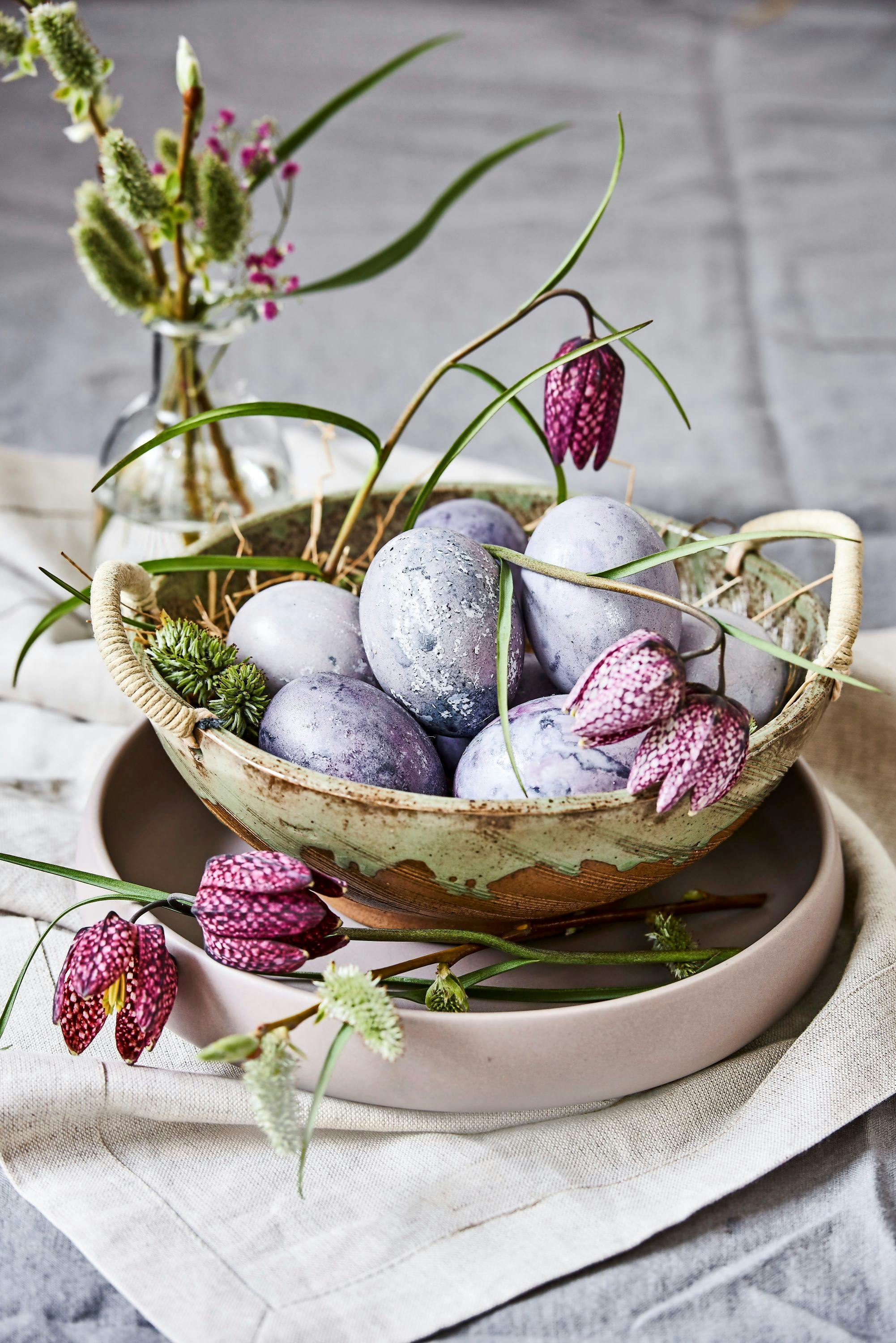 Du kan nemlig sagtens lave dine egne naturlige påskedekorationer. Prøv f.eks. denne med naturligt farvede æg i pastelfarver.