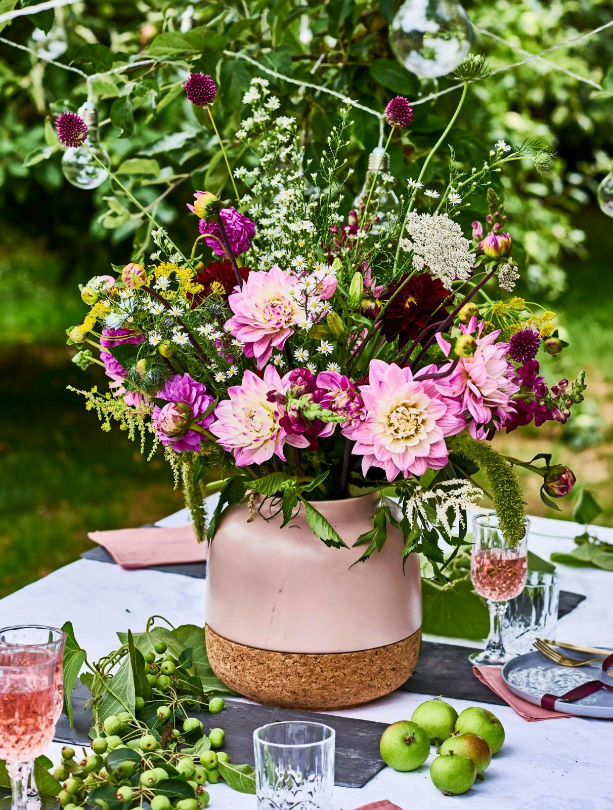 En bordbuket er meget mere end blomster. Den kan slå stilen an til festen og straks løfte gæsternes humør. Denne lidt vilde buket i lyserøde og gule toner signalerer uhøjtidelig sommerfest i haven.