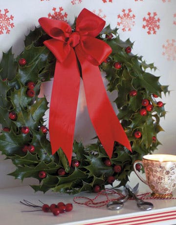 Sæt friske, blanke kristtjørnblade fast på halmkransen hele vejen rundt. Brug knappenåle eller en klipsemaskine til at fæstne bladene. Sørg for, at klips eller knappenål dækkes af det efterfølgende blad. Stik de røde lakbær ind imellem bladene hist og her. Slut af med at binde en fed dobbeltsløjfe øverst på kransen. Klip båndene, så de får split.