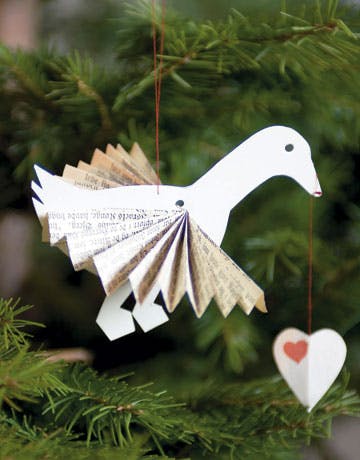 Klip gåsen ud i hvidt hobbykarton efter skabelonen, og lav en revne hvor anvist. Fold silke- eller bogpapiret til en vifte. Stik den igennem den udklippede revne i gåsen, og sæt den fast med lim, eller klips den til bagkroppen. Klip et lille hjerte ud i mønstret papir, og sæt den røde sytråd fast i næb og hjerte.