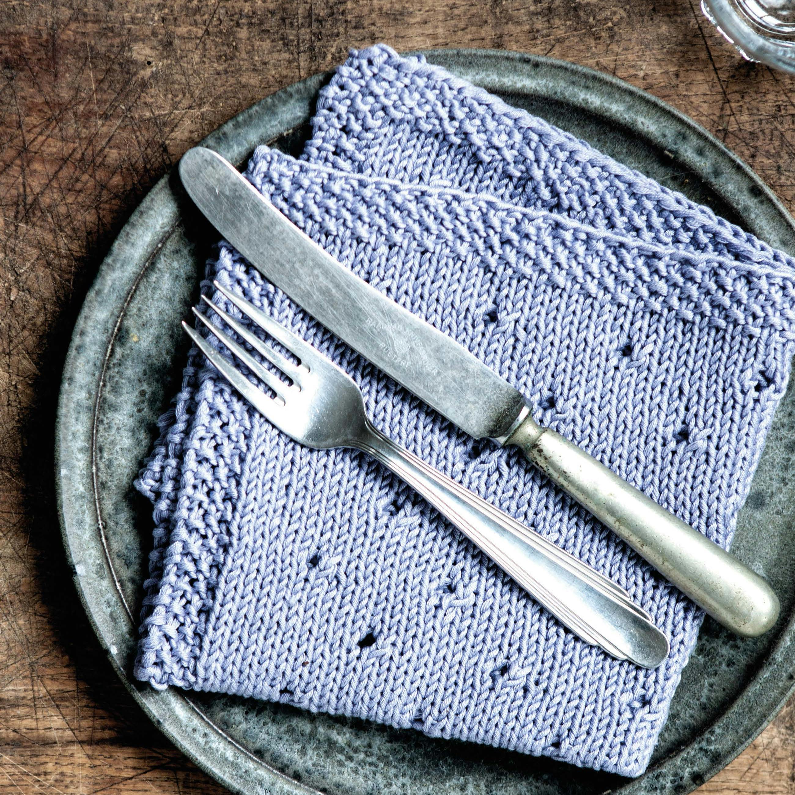 Lav en sød, strikket syrenfarvet serviet med hulmønster. Det fine, hullede mønster gør servietten let og lækker i det halvblanke bomuldsgarn. Se opskriften her!
