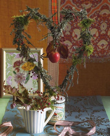Du kan finde velegnede grene i de mere fugtige dele af skoven, hvor grenene er besat med lav. Til hjertet bruger du et lille bundt grene, som er klippet eller brækket i mindre stykker. Grenene kan opbevares fra år til år og ændrer stort set ikke udseende. Du kan godt lade grenene ligge udenfor, dog ikke i direkte regn. Når grenene bliver for tørre, bliver de meget porøse at arbejde med.