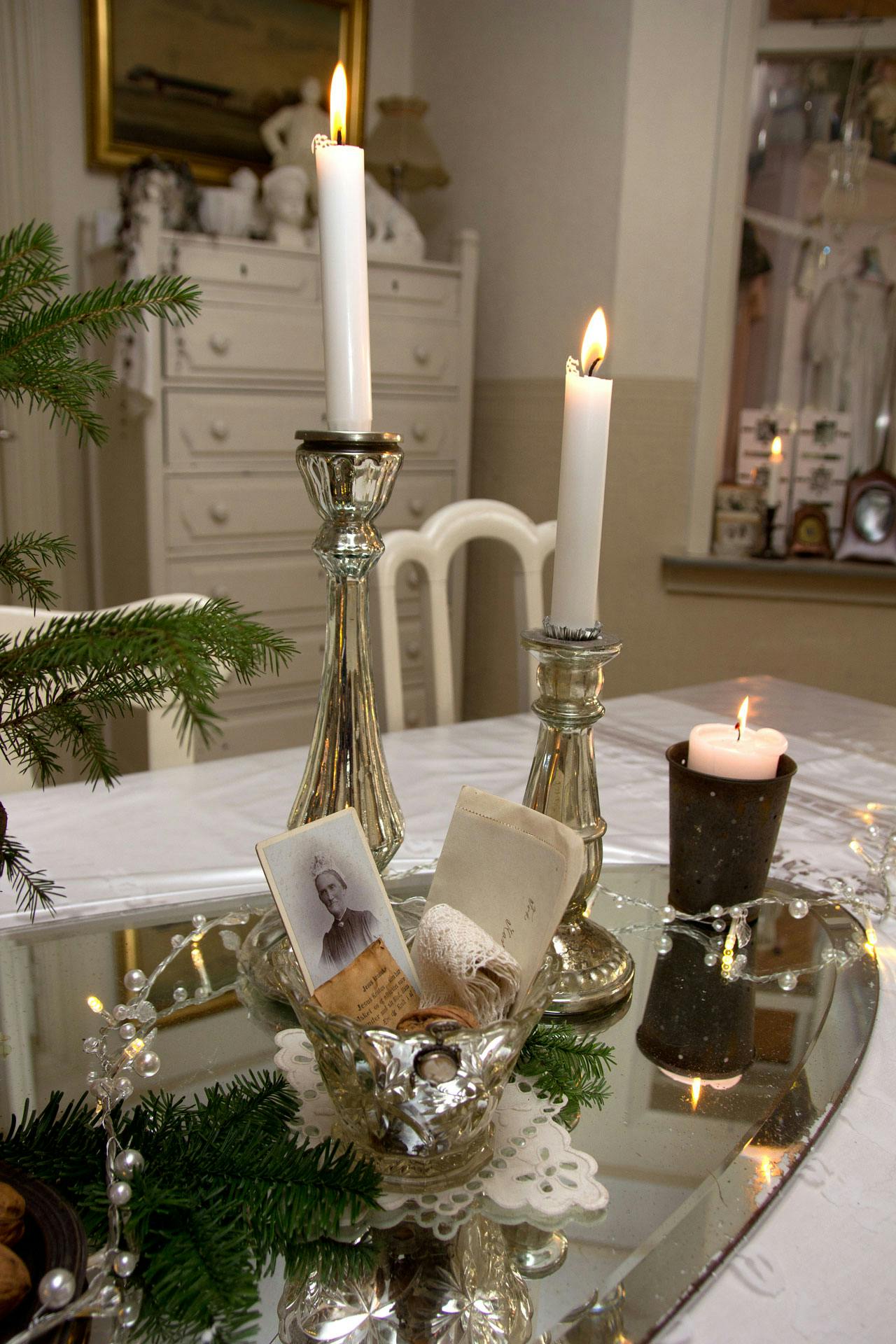 I oktober begynder juletingene at komme ind i butikken, og i november rykker julen ind i det private hjem. Karin holder mest af diskrete hvide og creme nuancer, blandet med sølv og pynt fra naturen med masser af gran, kogler og grene fra haven.