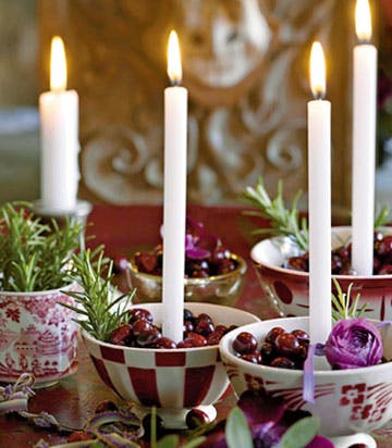 Saml flere skåle på et fad eller en bakke, og læg lidt tranebær, eukalyptusgrene og pyntebånd ved hist og her. Sæt fire skåle sammen, og du har en alternativ adventsdekoration.