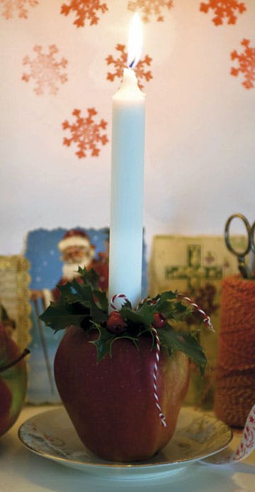 Udhul æblet, så der bliver plads til lyset. Klip stilkene på kristtjørnbladene skråt af, og stik dem forsigtigt ned i æblet rundt om lyset. Brug eventuelt et par knappenåle, hvis stilkene ikke er lange nok.