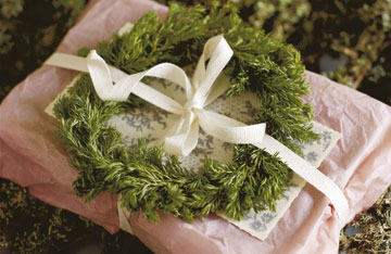 Denne feminine gave er pakket ind i lyserødt, krøllet silkegenbrugspapir og bundet med et fint hvidt bånd. På det søde købekort har vi lagt en enkel krans bundet af enebær fra haven. En sød ekstragave, som bagefter kan hænges op i båndet i et vindue.