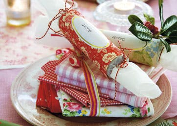 Mal røret med en lille pensel ind- og udvendigt. Lad det tørre. For røret med silkepapir i den ene ende, og læg gave eller godter i røret. Slut af med endnu lidt silkepapir. Rul røret ind i pergamentpapir, og vrid enderne rundt. Bind bånd rundt om enderne med en lille sløjfe som afslutning. Klip det mønstrede papir i samme bredde som røret, og gør det fast med tape. Sæt navnemærkaterne på røret.
