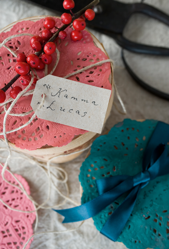 Brug for eksempel trææsker fra brieosten, vask dem og brug dem som små gaveæsker. Du kan lime flotte julemotiver i magasiner eller runde kageservietter på og slutte af med et fint silkebånd eller noget groft, rustikt snor. Sæt eventuelt en lille grankvist ved sløjfen.