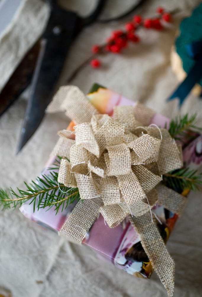Brug pap fra gamle kasser til at pakke gaverne ind i. Brug strimler af stof som enten er revet i lange bånd eller klip ud med en zigzag-saks. Du kan også beklæde papkassen med smukke billeder fra gamle magasiner, som du klipper ud og limer på. Væg for eksempel billeder som matcher i farverne og slut af med en lille gren af kristtjørn.
