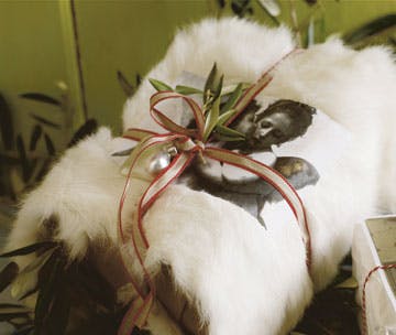 En gaveæske er først pakket ind i brunt slagterpapir, og derefter er det fine hvide kaninskind lagt rundt om. Det sort-hvide stykke papir med engle på er en fotokopi fra en bog. Det har fået et par klatter lim hist og her og er derefter drysset med lidt guldstøv.