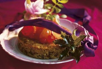 Køb en sød tallerken i en genbrugsforretning, eller måske har du en sød tallerken i gemmerne. Læg kagen på tallerkenen sammen med de syltede frugter, bind en stor sløjfe om kagen, og læg en lille grøn kvist ved. Her har vi brugt kristtjørn.
