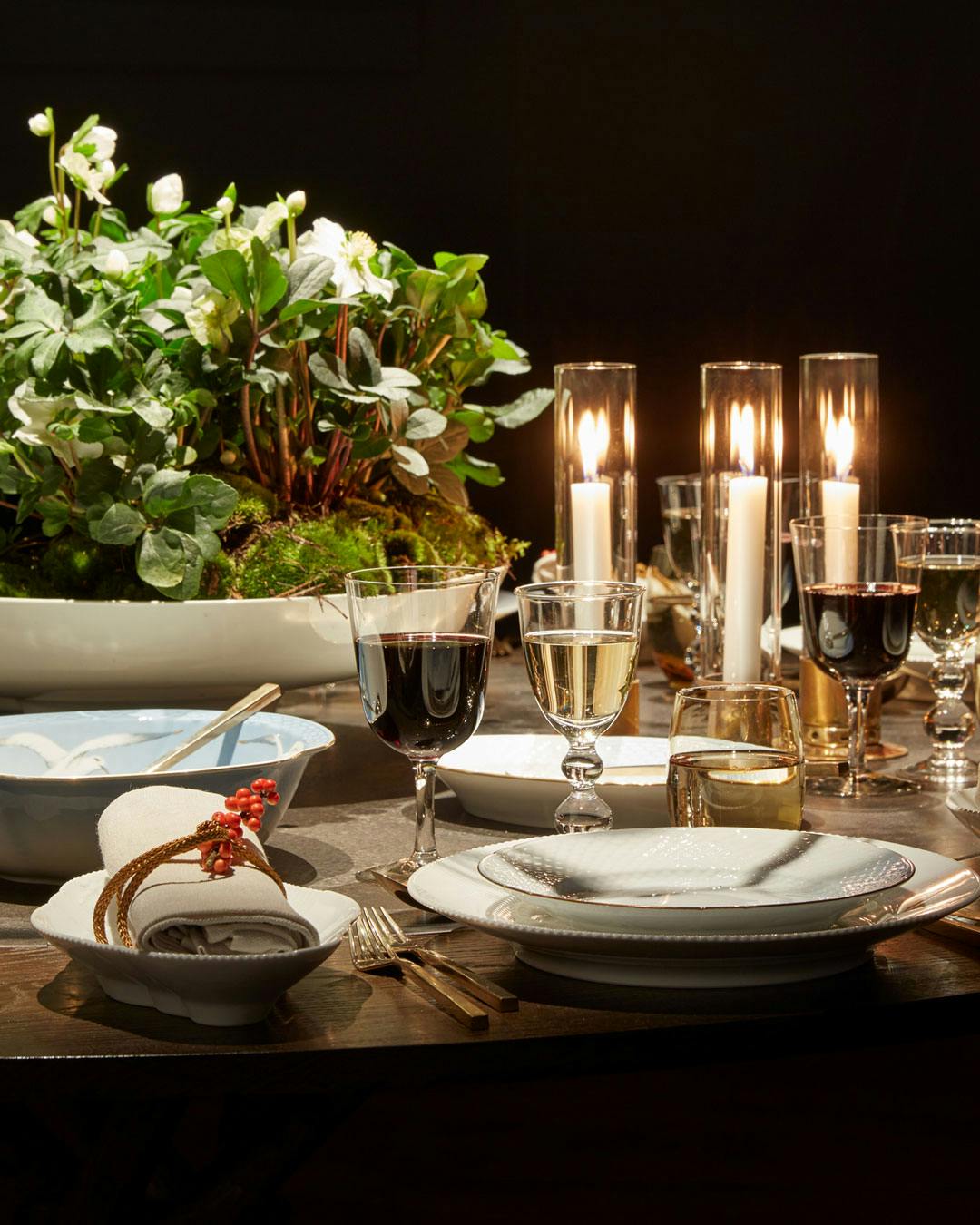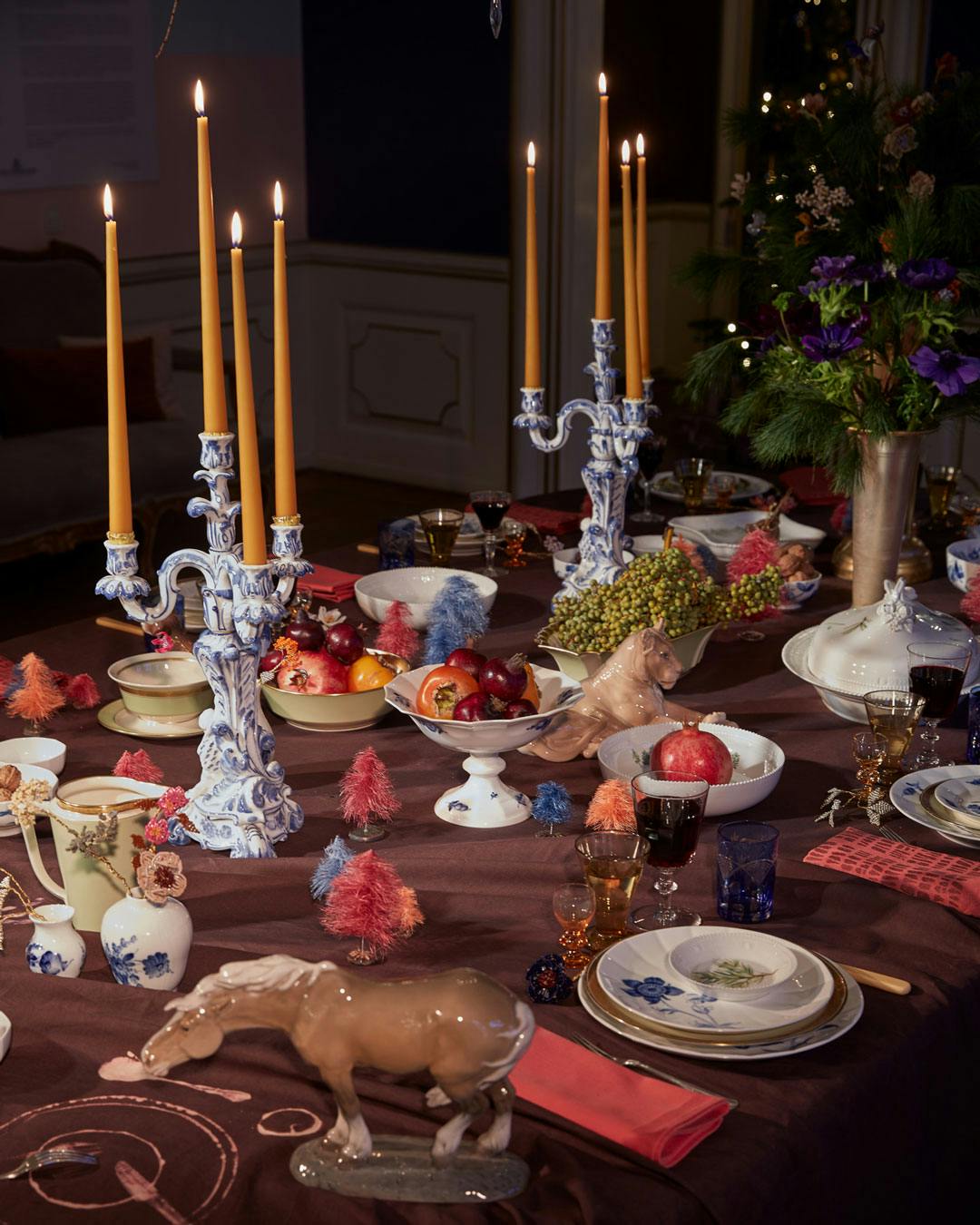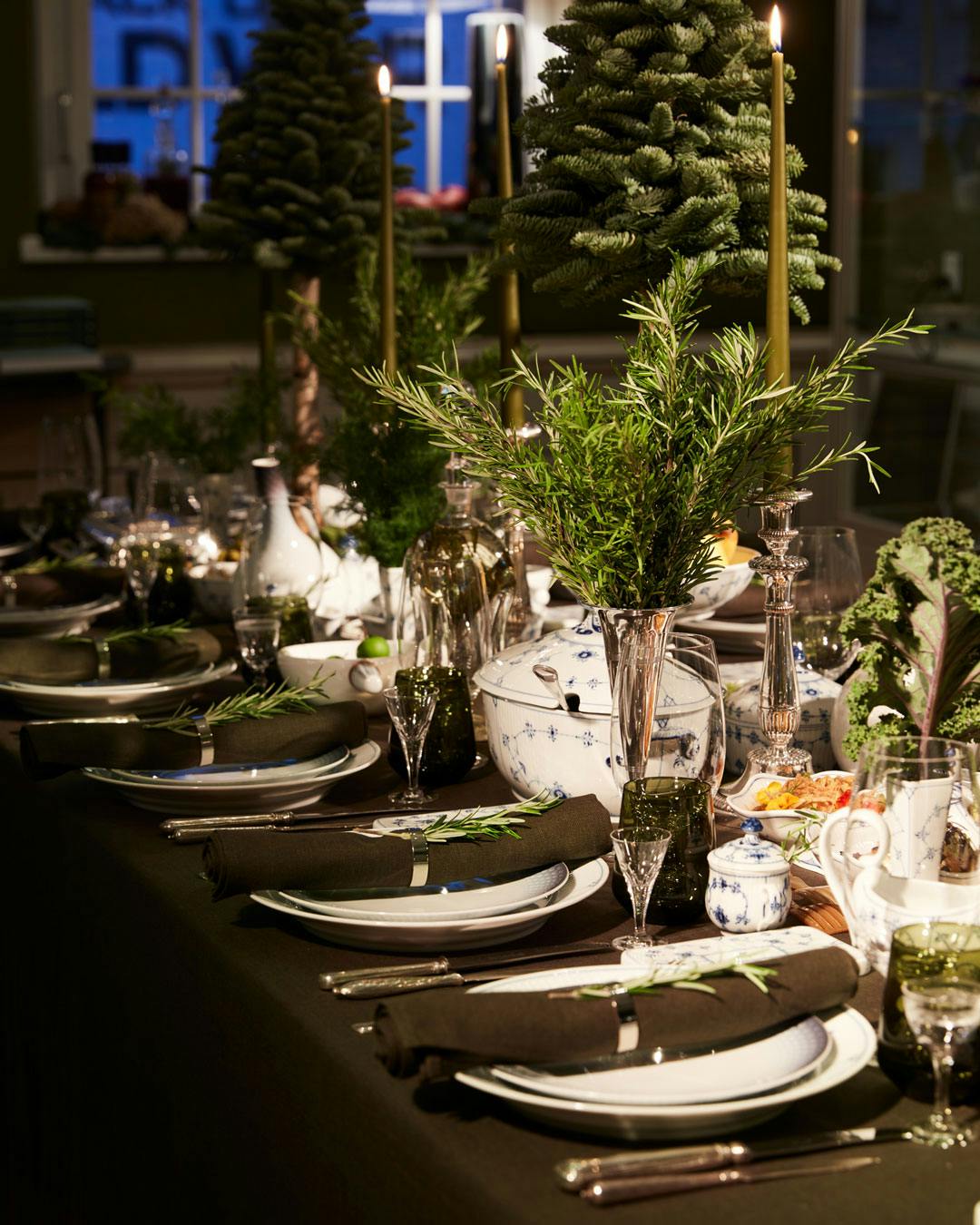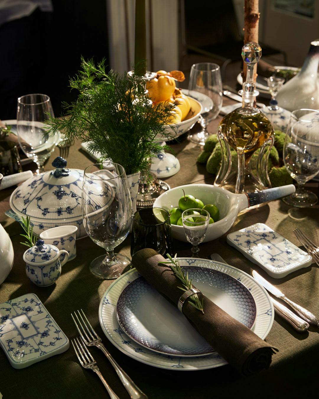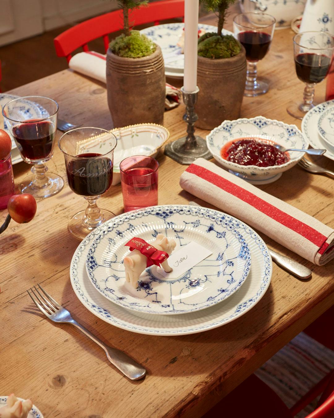 Klassisk Musselmalet hel- og halvblonde, som er gået i arv, møder Blå Elements og dele fra Prinsesse-stellet med de fine blå blonder. Et rustikt bestik af tin og svenske træstager giver, sammen en håndsmedet jernkrans, pyntet med æbler, gran og levende lys, lidt kant til julebordet. Selvom den svenske jul med sit miks af danske og svenske traditioner, er et kollektivt projekt, så rammer sceneriet ifølge Ida Wohlert lige ind i hendes glæde ved at være lige der, i krydsfeltet mellem det fine og det jordnære, mellem kaos og perfektion.