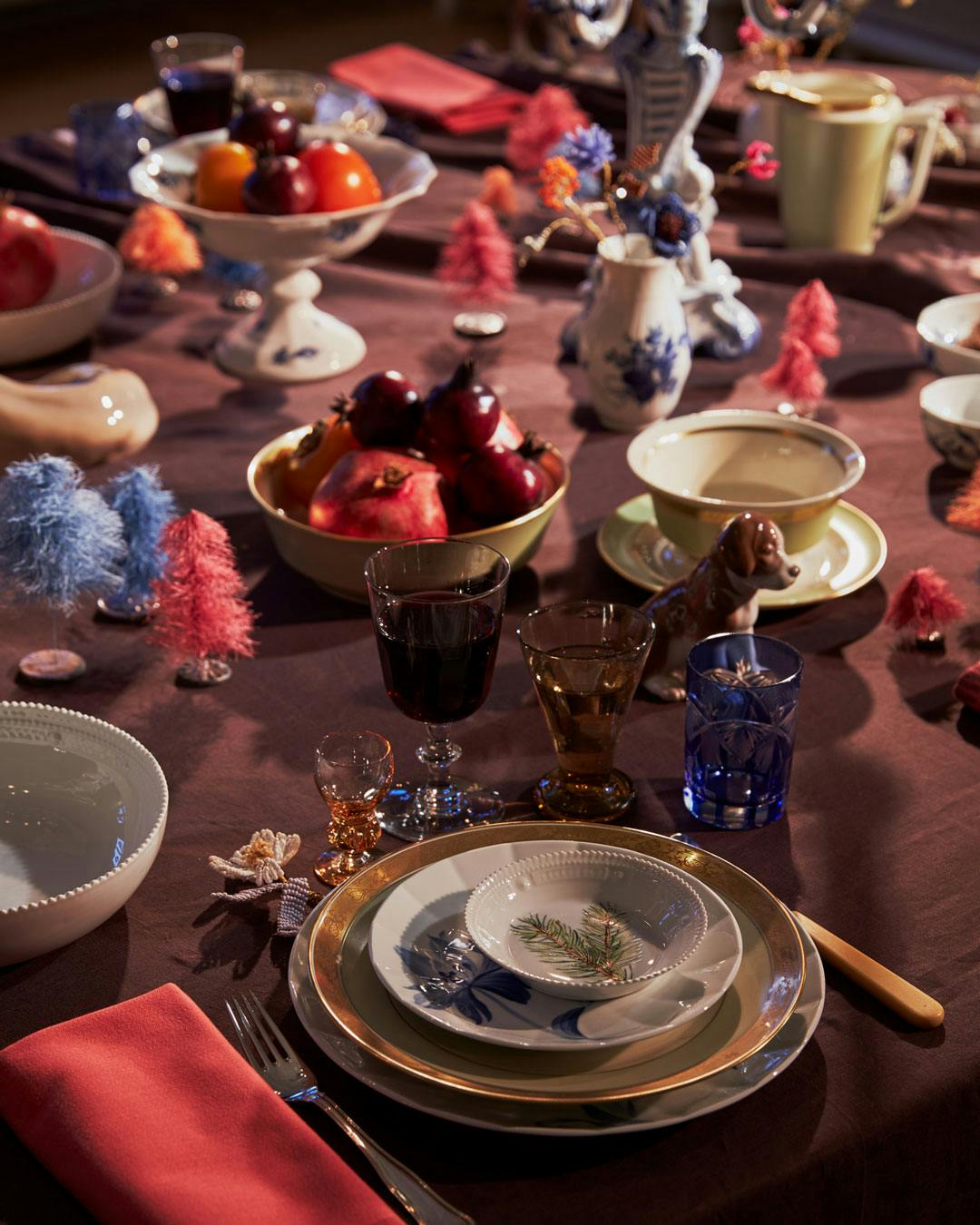 Der hersker, ifølge Andrea, det perfekte kaos på hendes julebord, hvor hun blander stilarter, arvestykker og porcelæn, som rummer gamle familiehistorier. Forældrenes pistaciegrønne Dagmar-stel fra 1930’erne finder sammen med det klassiske Blå Blomst fra 1779 – to stel, der har fulgt Andrea igennem barndommen. Blå Blomst er i hendes familie kendt som ”æggestellet”, fordi hendes oldemor solgte gårdens æg og købte porcelæn for pengene. Det moderne Blomst-stel fra 2018 binder fortid og nutid sammen.