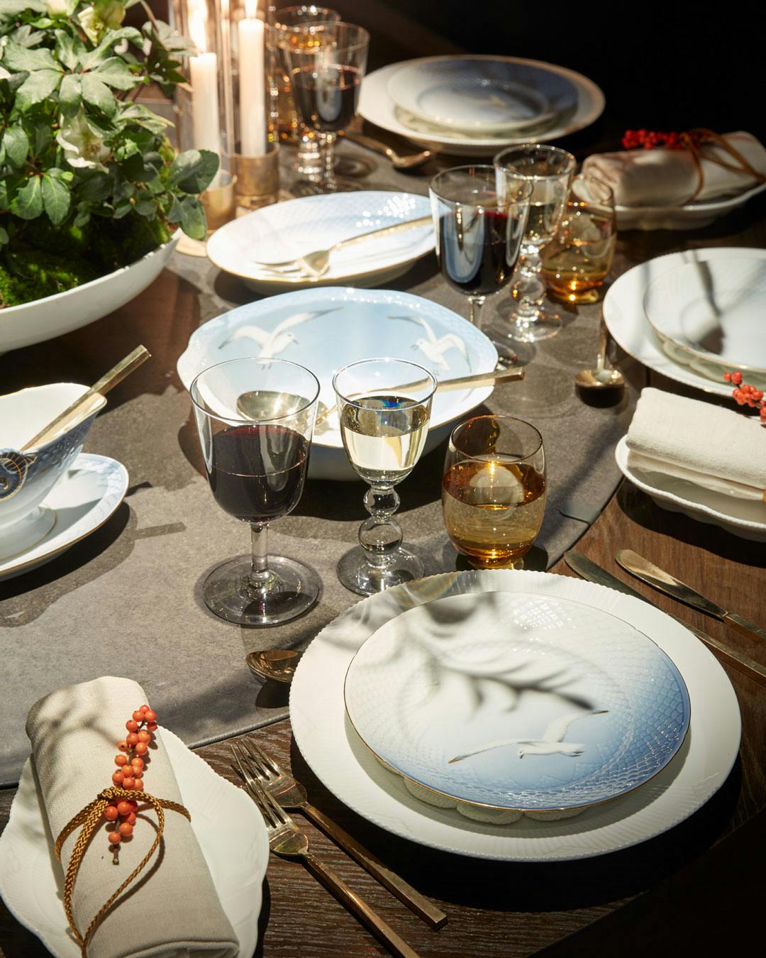 Der er strandsand på gulvet under de krydsede ben på det rustikke betonbord, hvor mågerne på det ikoniske Mågestel fra 1895 tager os med ud, hvor der højt til himlen. Det historiske stel blandes elegant med det stringente porcelæn fra Hvid Elements og af enkelte dele af Multifarvet Elements. Glas med fuglemotiver, levende lys i stager hentet hjem fra Skagen bringer lys og varme til bordet - og over hele herligheden svæver en håndlavet lysekrone i messing kranset med havtorn, som med sine flammende, orange bær får juleglæden til at blusse.