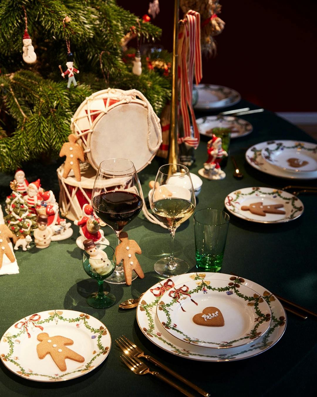 Som en særlig hilsen til nåleskoven har Andrea helt exceptionelt fået bemalet fade med forskellige typer nåletræer af en af Royal Copenhagens dygtige Flora Danica-malere. Det kreative udtryk er smukt afrundet med eksempler på de julebreve, som Andrea altid skriver – og som netop i år er velmenende råd til det kommende år, hvor så meget endnu er uvist. Bordet komprimerer det perfekte kaos, som giver plads til at være menneske og til at føje nye fortællinger til de gamle og velkendte.