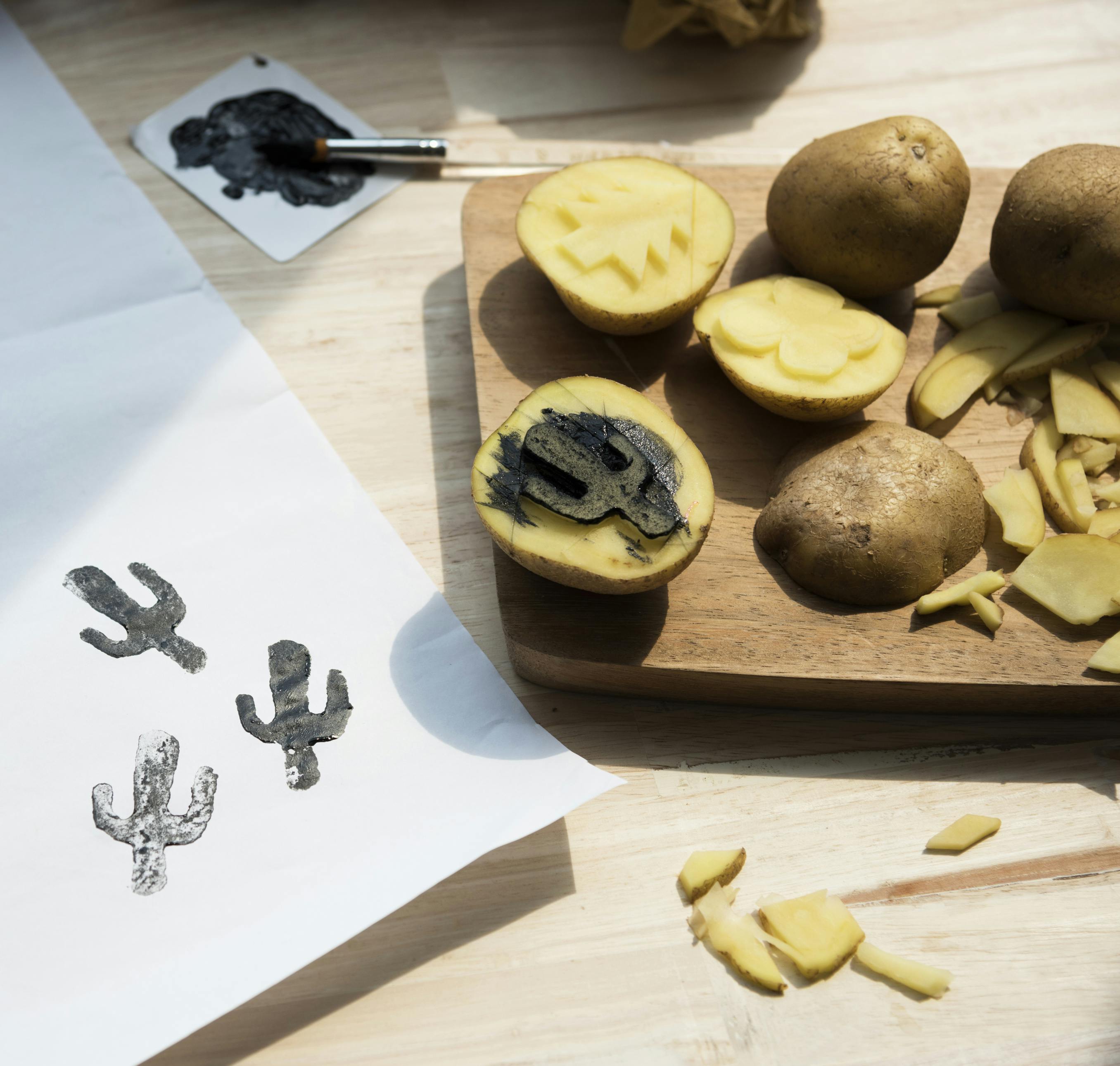 Kartoflernes struktur sætter et flot aftryk, der kan dekorere både papir og tekstiler.
