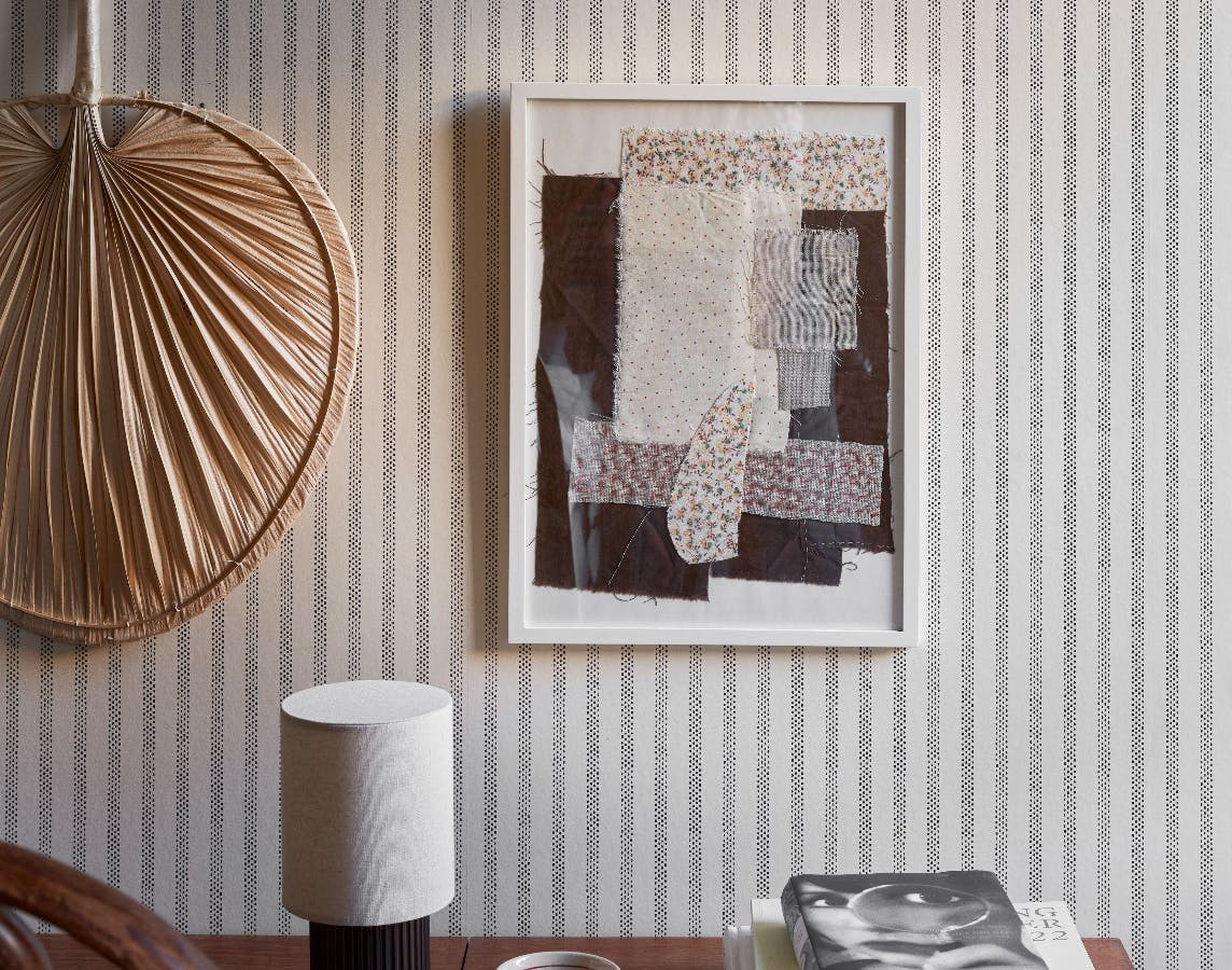 Lampe fra &Tradition, kop fra Sakura og vifte fra Beau Marche. Rammen er købt i Søstrene Grene, og tapetet er fra TapetCafé.