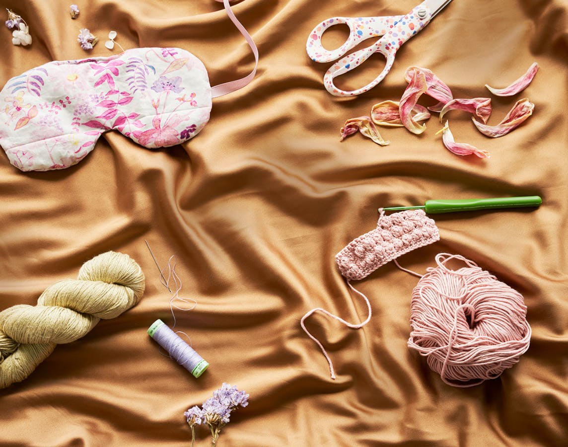 Hjemmesyet øjenmaske i silkestof og silkebånd.