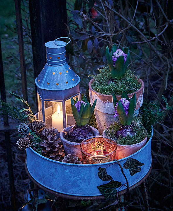 På artiklens billede gemmer en gammel trækasse på bl.a. kogler og perlehyacinter, og det hyggelige stearinlys er med til at skabe den dejligste stemning.