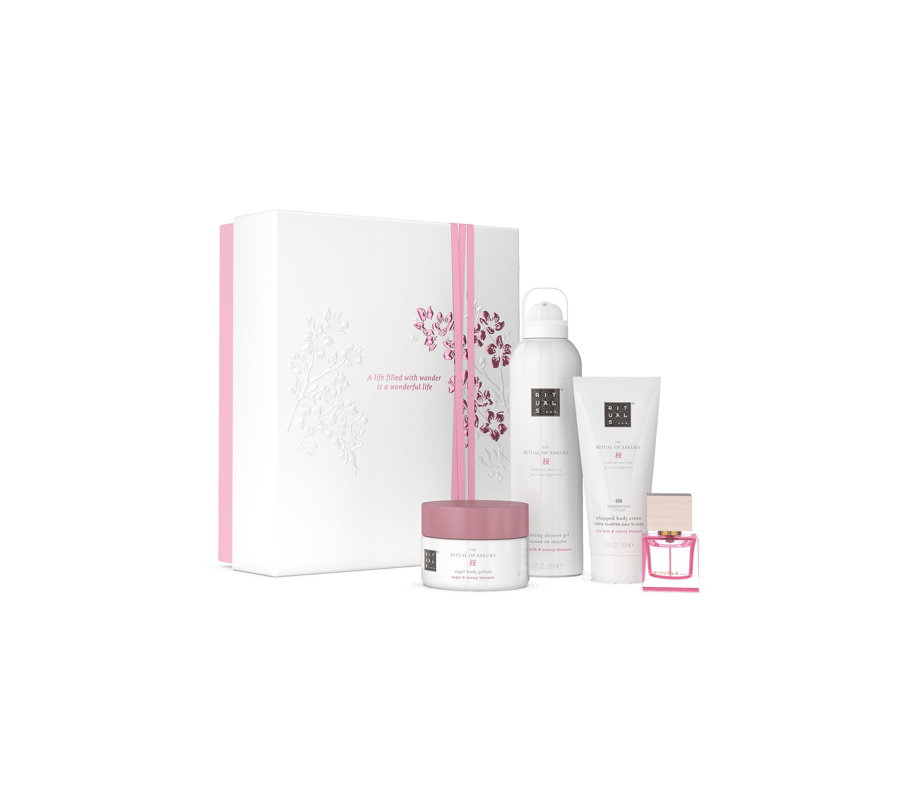 Dette delikate gavesæt tager udgangspunkt i den japanske, livsbekræftende højtid Sakura. Seriens produkter, herunder showergel, bodyscrub, bodycreme og parfume er beriget med en særlig duft af japansk kirsebærblomst, der har en let, floral duft. Det er den oplaget gaveidé til dem, der elsker små, ophøjede øjeblikke af luksus og ro, og som elsker at tage sig tid til egenomsorg og velvære.
