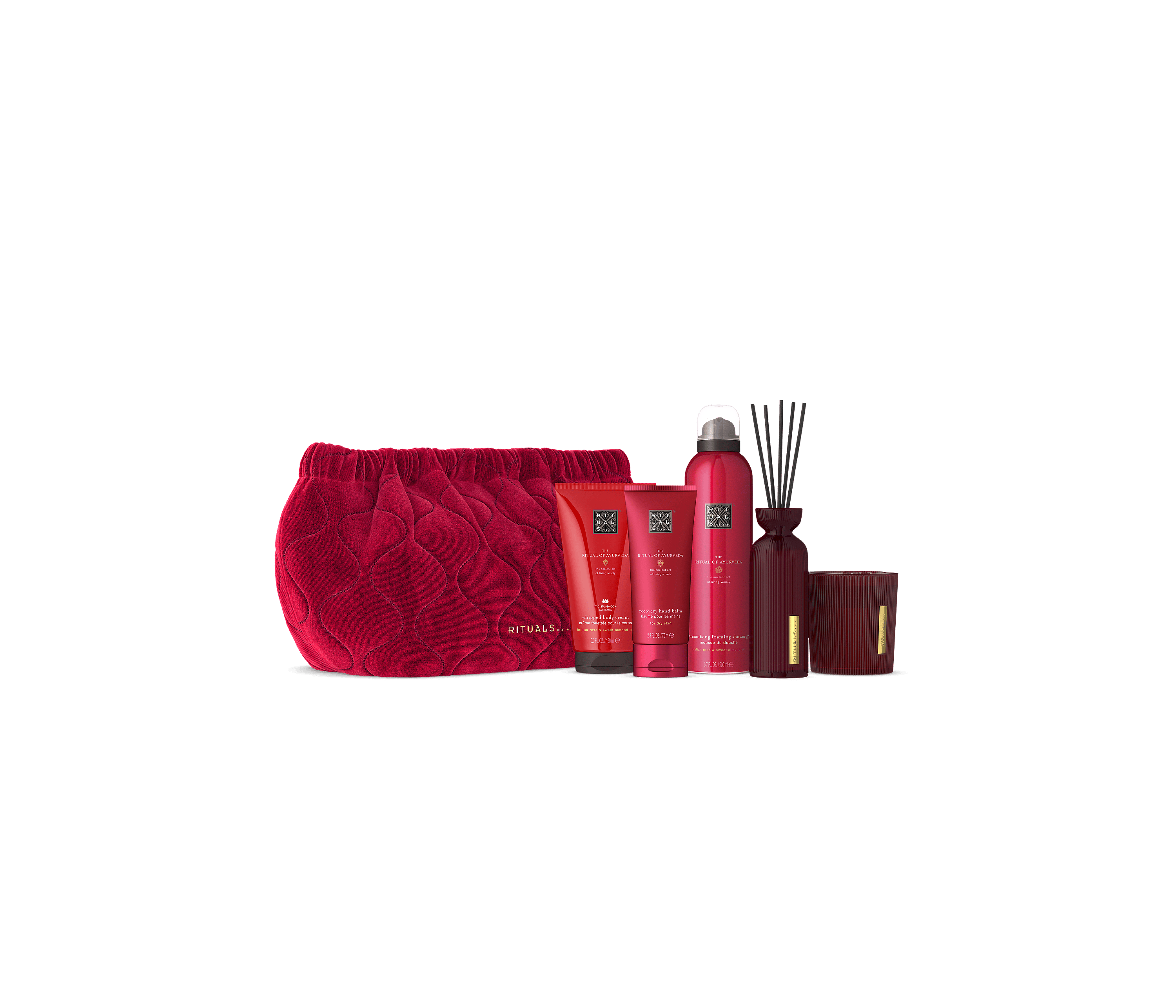 Dette er gaven til dem, der virkelig er tunet ind på egen krop, og ved hvordan sanserne påvirker det kropslige i holistisk synergi. Sættet indeholder fire plejende produkter med duften af indisk rose og sød mandelolie – fra skummende kropsgel til nærende bodycreme og en mist til hår og krop, og tager udgangspunkt i gamle ayurvediske dufte og traditioner. Den smukke taske, som produkterne ligger i, fungerer både som toilettaske og elegant clutch.