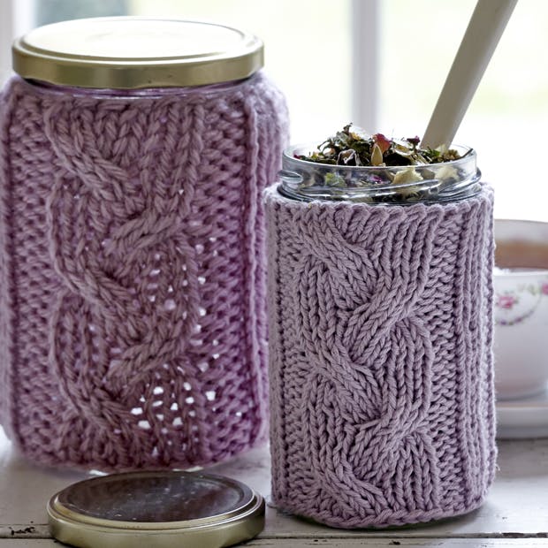 Opbevar din bedste te i fine glas med strikket betræk omkring. Se her, hvordan du laver det fine, fingernemme projekt!
