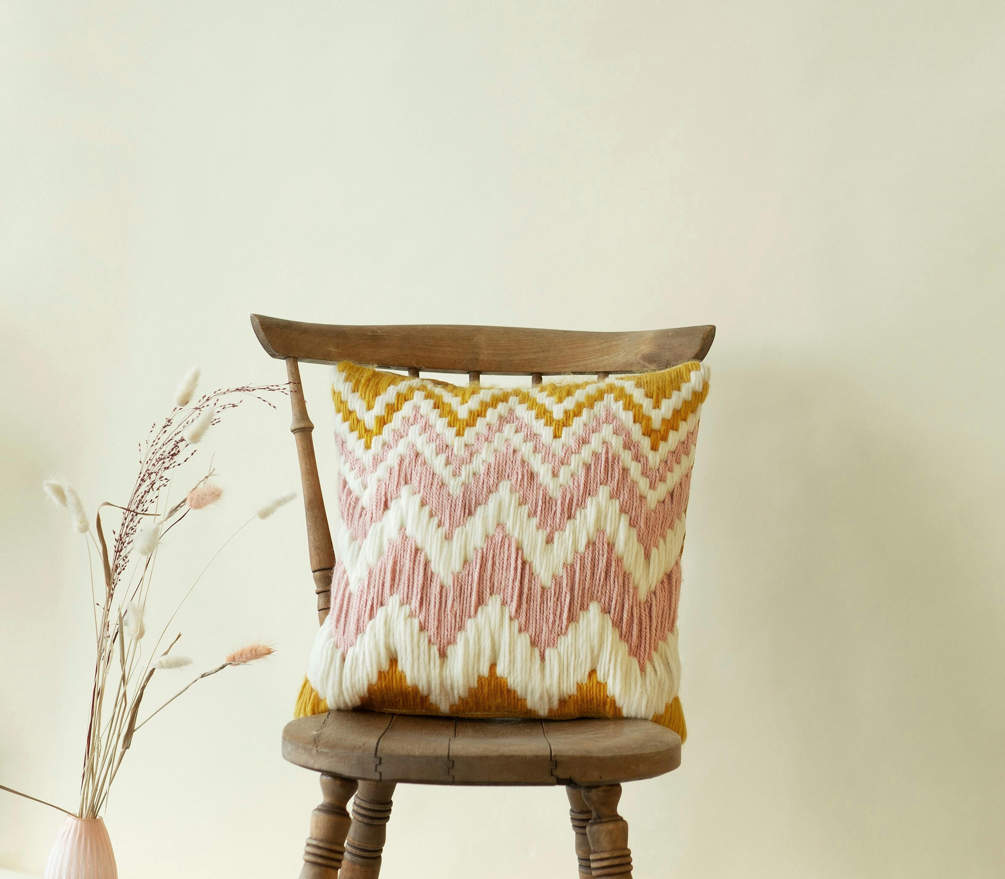 Er strikkekurven fuld af garnrester, kan du bruge dem til at brodere et smukt zigzagmønster på en pude. Vælg tre farver garn, og sy med lange sting efter vores diagram – det er slet ikke så svært, og din pude bliver helt unik.