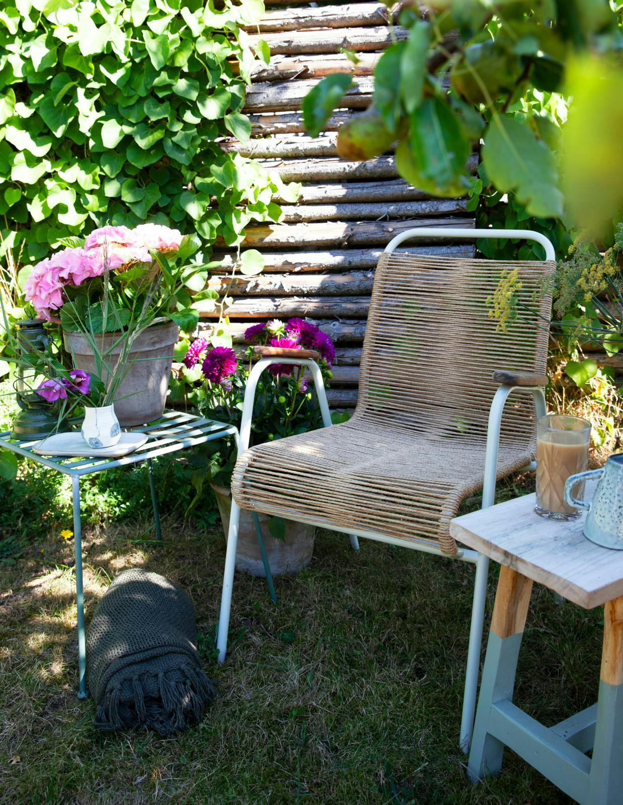 TRIN 6: Flet ryglænet på samme måde. Begynd oppefra, og flet ned langs ryggen. Fæstn snoren, og klip af. Stil din nye havestol på terrassen eller i et hjørne af haven eller altanen.