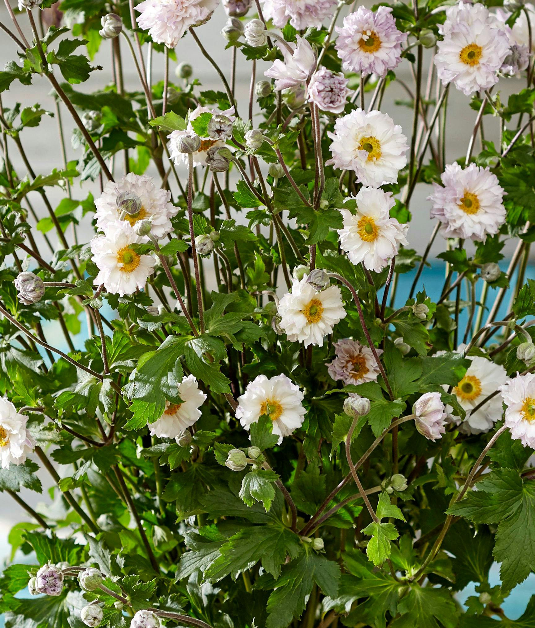 Skøn, halvfyldt høstanemone med kronblade, der changerer imellem hvid og pastelrosa. Vælg gerne en dyb krukke for at gøre god plads til rødderne og en næringsrig pottemuld. Den blomstrer fra sensommeren til langt ind i efteråret og vil stå godt sammen med en krukke med f.eks. en mørk Heuchera eller anden rødbladet plante. Hvis den med tiden vokser ud af krukken, kan du plante den ud i et område i haven med let skygge.