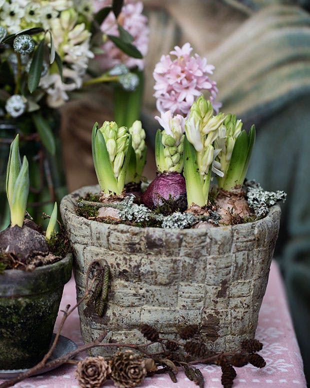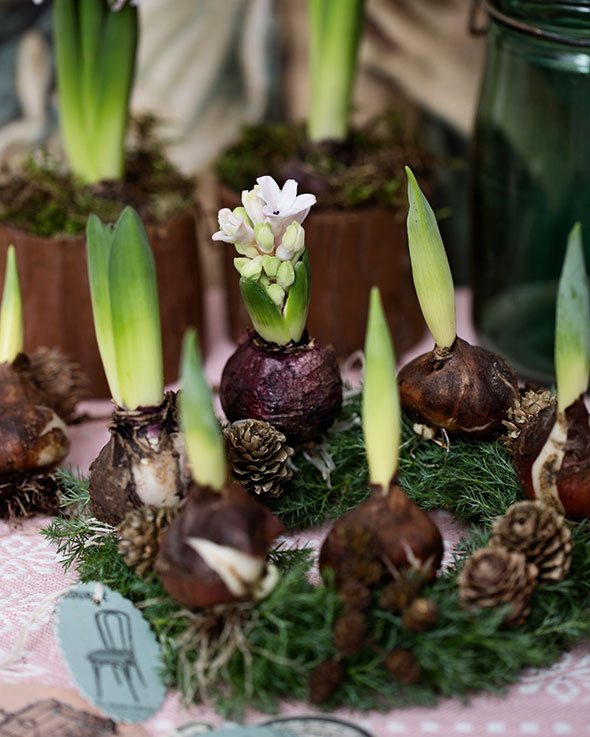 Hyacinter, tulipaner og perlehyacinter hører til blandt havens forårsbebudere, men da planterne kan drives tidligere i blomst, kan de nydes allerede i december og januar. Planterne købes i potter, hvor der kun er bittesmå spirer, der titter frem fra jorden. Når de kommer ind i varmen, forvandler de sig til flotte blomstrende vækster.