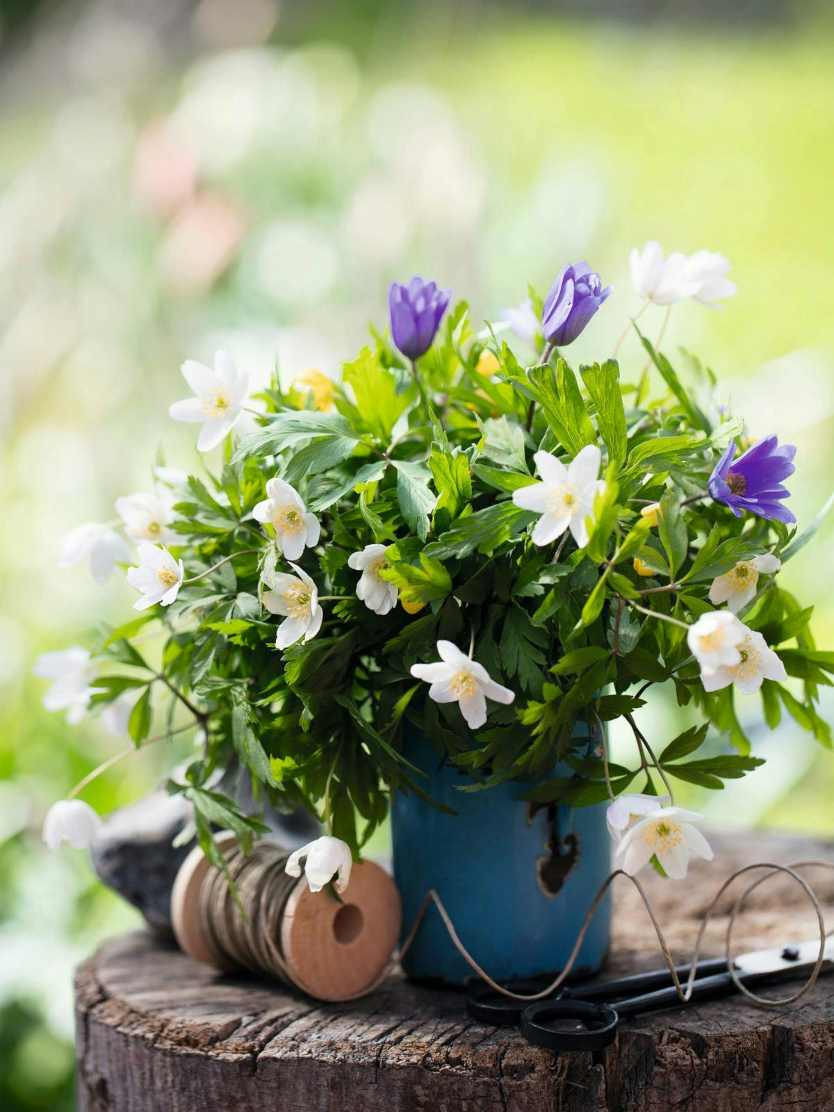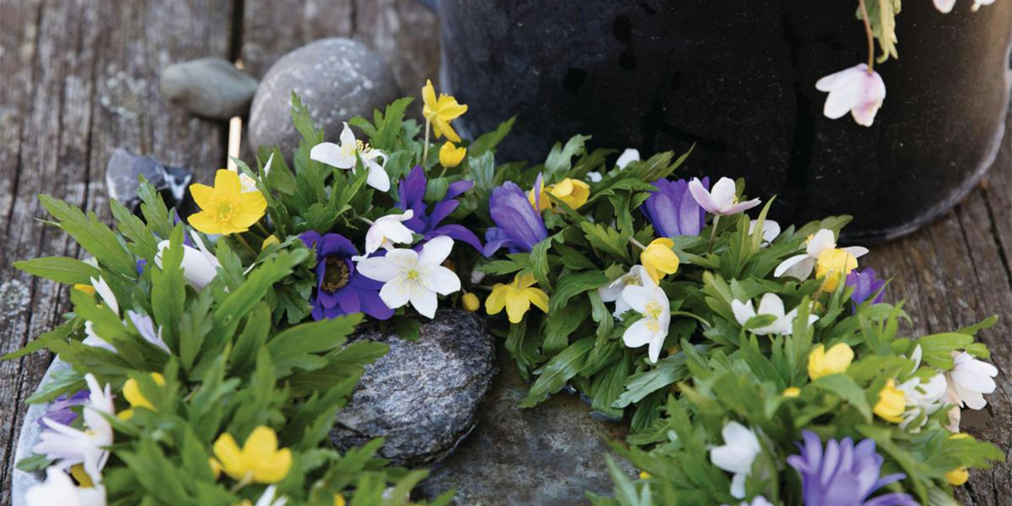 En krans fyldt med anemoner ser helt eventyrlig ud, hvis du blander hvide og gule anemoner med blå balkananemoner.