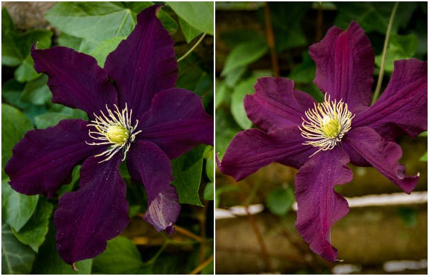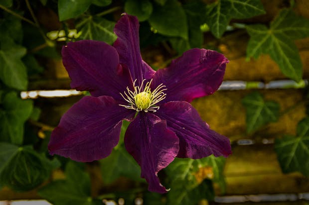 Clematis ’Warszawska Nike’ foretrækker fuld sol, men klarer sig også fint i skygge. Den får purpurfarvede og dybviolette blomster, med en gul midte der foralvor understreger kronbladenes stærke farver.