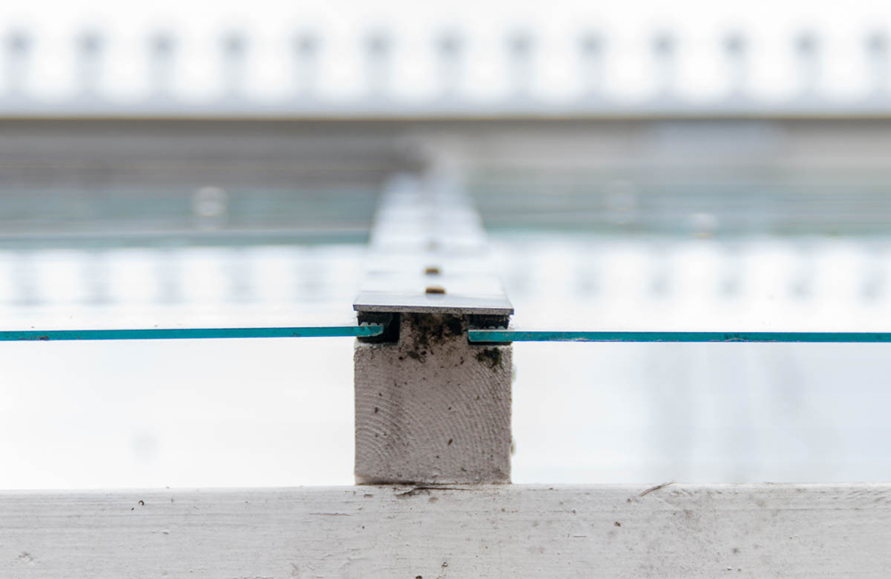Jeg satte tagglas fast på drivhuset ved at fræse en fals, fordybning, på begge sider af alle de midterste spær. Men hvis jeg skulle gøre det om i dag, ville jeg save falsen på en bordsav, så der ikke kom så mange spåner. De yderste spær skulle naturligvis kun have en fals ind mod de andre spær. Jeg lavede en fals på ca. 8 mm og lagde et glasbånd af UV-bestandigt gummibånd ned mod falsens kant. Gummibåndet var selvklæbende og kunne uden problemer monteres i falsen. Oven på gummibåndet satte jeg glasset på, startende nederst. Jeg satte små s-formede “clips” fast i glassets øverste kant, så de kunne holde det næste stykke glas fast. Sådan fortsatte jeg arbejde, indtil toppen var nået. Læs også: Sådan byggede vi drivhuset