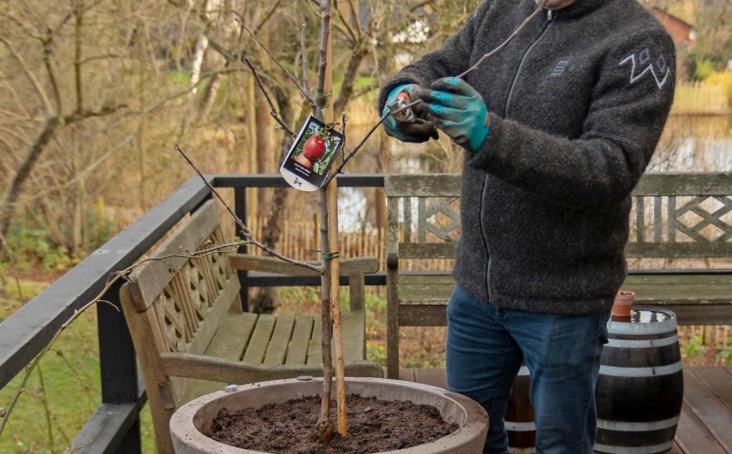 Har det nyplantede træ enkelte lange, tynde grene, der stritter, kan de klippes af. På den måde kan du give træet en let studsning, så det holder spindelformen. Træer i krukker kræver generelt lidt mere beskæring end træer i haven, da det er med til at sikre, at træet ikke bliver for stort til potten og dermed mistrives.