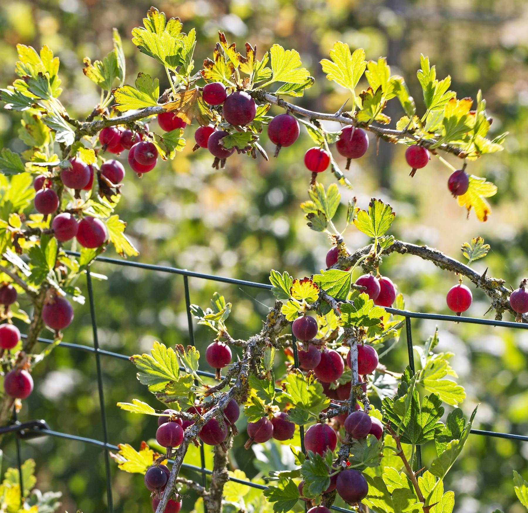 Det kan være en fordel at binde din stikkelsbærbusk op eller espaliere den. Dels er det nemmere at plukke bærrene uden at stikke sig på de tornede grene, dels får bærrene mere sol, og så tørrer bladene hurtigere, så du undgår angreb af stikkelsbærdræberen, som er en svamp, der kan angribe blade, bær og stængler.