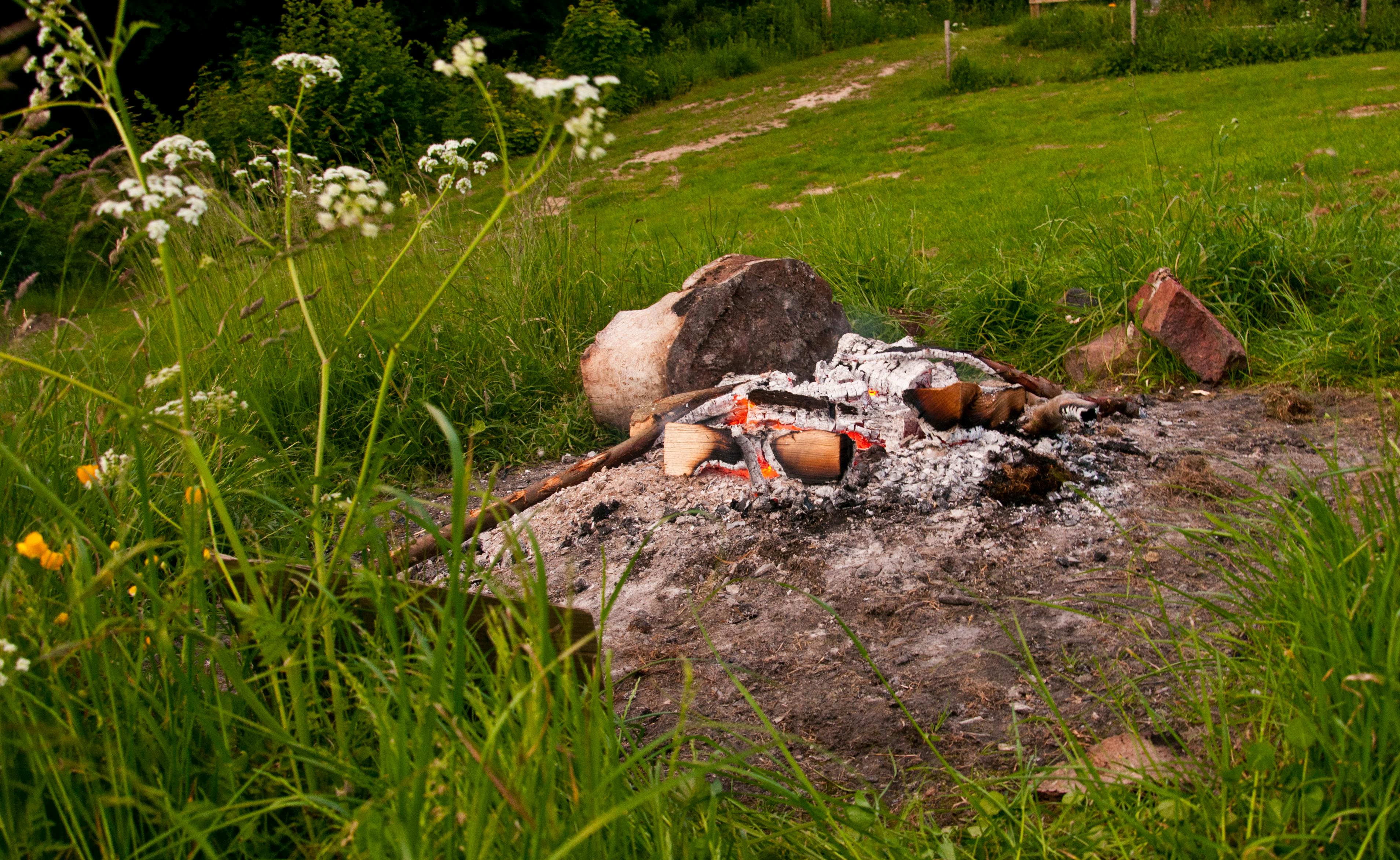 Det simple bålsted består af en ring af nedgravede kampesten, der skærmer, når bålet skyder - stenene sørger for at holde ilden ude af græsset, og samtidigt give børn og andre snobrødselskere et sted at hvile snobrødspinden.
