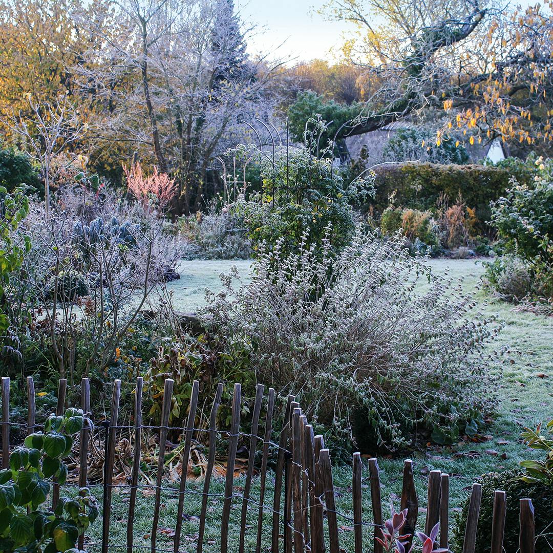 Flere af havens træer og buske er valgt ud fra deres gren- og stammestrukturer. Det giver perspektiv og farve og koboltblåt skyggespil over sneen en vinterdag.