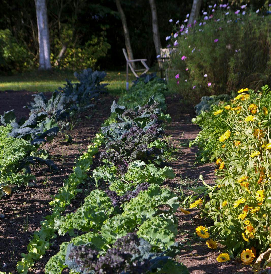 I grøntsagsmarken er der alle former for rodfrugter, bønner og kål, som står på lange rækker. Annette har sået snitblomster som morgenfruer og stolt kavaler mellem urterne.