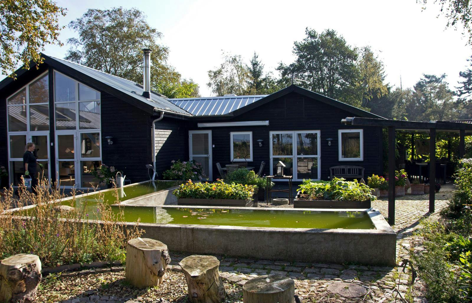 Det L-formede bassin foran huset er frostfrit og opsamler regnvand fra tagene via nedløbsrør og en hjemmebygget akvædukt. På den måde kan regnvandet genbruges i haven. Bassinet er frostfrit og kan rumme 20.000 liter, så Annette og Frank undgår at bruge vandhanevandet selv i de tørre perioder.