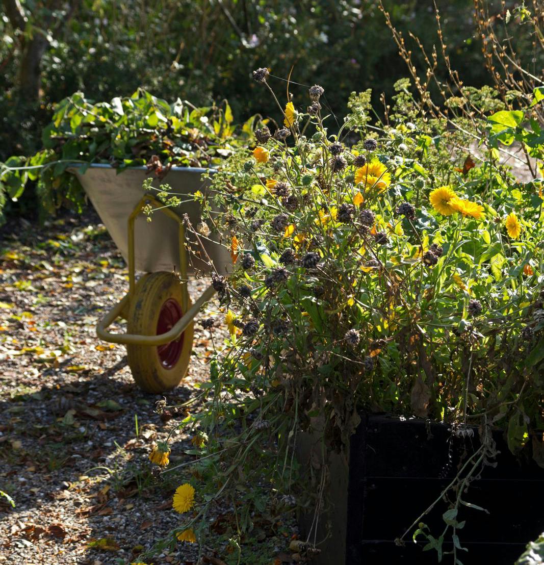 I det tidlige efterår bugner køkkenhaven stadig af både blomster og grøntsager. Men de fleste af stauderne får lov at pryde haven hele vinteren med smukke frøstande, og først i det tidligere forår klipper Annette dem ned og luger bedene.