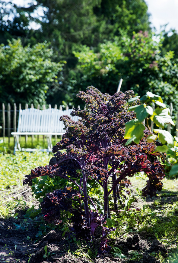 – For første gang har jeg prøvet lilla grønkål, der er smuk at lave salater af. Grønkålen kan sagtens stå i haven hele vinteren. Det er en taknemmelig plante, og den er fyldt med C-vitamin. Når der kun er stokken tilbage og et par få blade, får hønsene resten – de skal også have det sundt, siger fru Larsen.