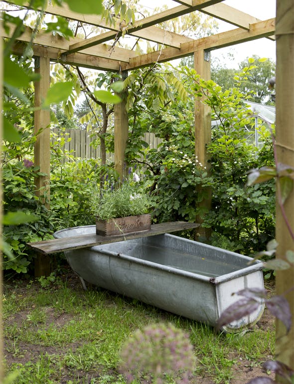 De buede bede i haven giver en fornemmelse af, at gå rundt i en lille oplevelsespark med snoede stier, og det er en rar følelse, der gør det spændende og eventyragtigt. I havens bede og på solterrasserne er der smukt og diskret placeret krukker fyldt med stauder i harmoniske farver. Flere steder i haven er der indrettet hyggelige og skønt møblerede solterrasser med borde og bænke, gammeldags fuglebure og krukker fra loppemarkeder og lokale livsstilsbutikker, som er med til at skabe liv og romantik og gøre haven til et særligt skønt sted at være.