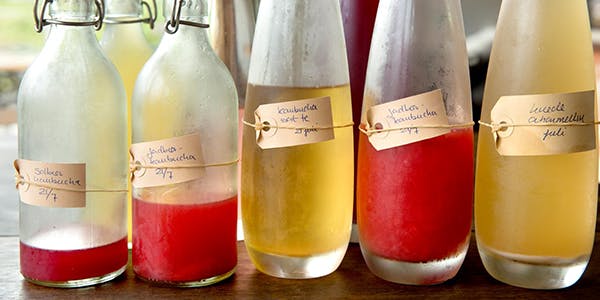 Vi bliver budt på forskellige kombuchaer, og Rikke viser os hemmeligheden bag – den imponerende store kombuchasvamp, der flittigt brygger de liflige drikke.