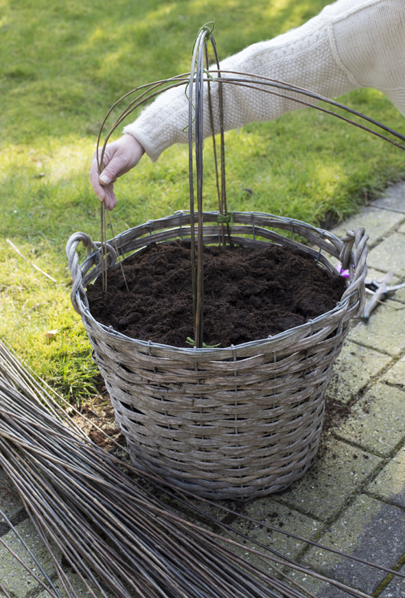 Guide: Pasning og pleje af klematis.Om foråret kan du stille krukken i et hjørne af haven og lade klematissen klatre op i fx en stor busk. Du kan også konstruere et espalier, som krukkeplanten kan klatre i, og stille den lige, hvor du vil. Vi har bygget et espalier af pil, som er let og hurtigt at lave, hvis du vil dyrke klematis i kurve eller potter.