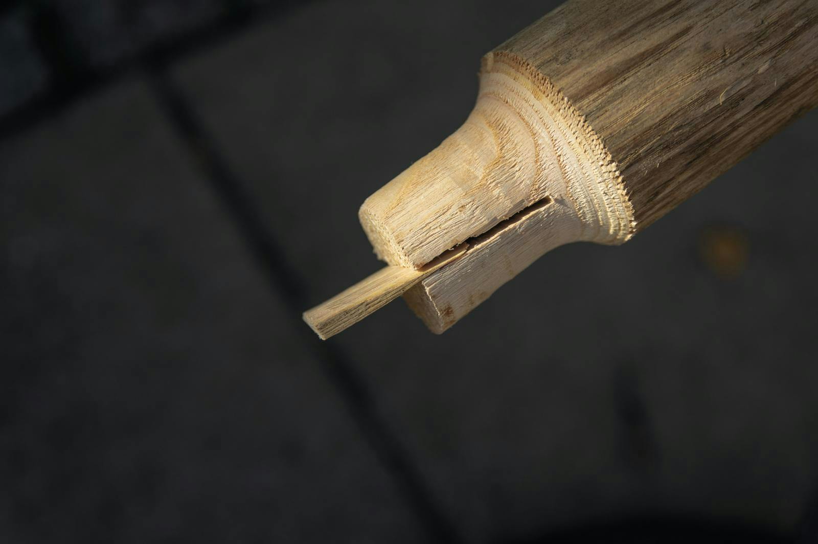 Step 3: Sav nu et spor i tappen på benene. Brug enten en fukssvans eller en bordsav, og sav midt i tappen og helt ned. Kilerne kan du lave af et stykke af dine stolperester. Brug en lille økse til at flække stykket i mindre stykker, så du får nogle grove spåner, der er et par mm. tykkere end sporet i tappen. Hug spånerne til, så de bliver tyndere i den ene ende og dermed kileformede.